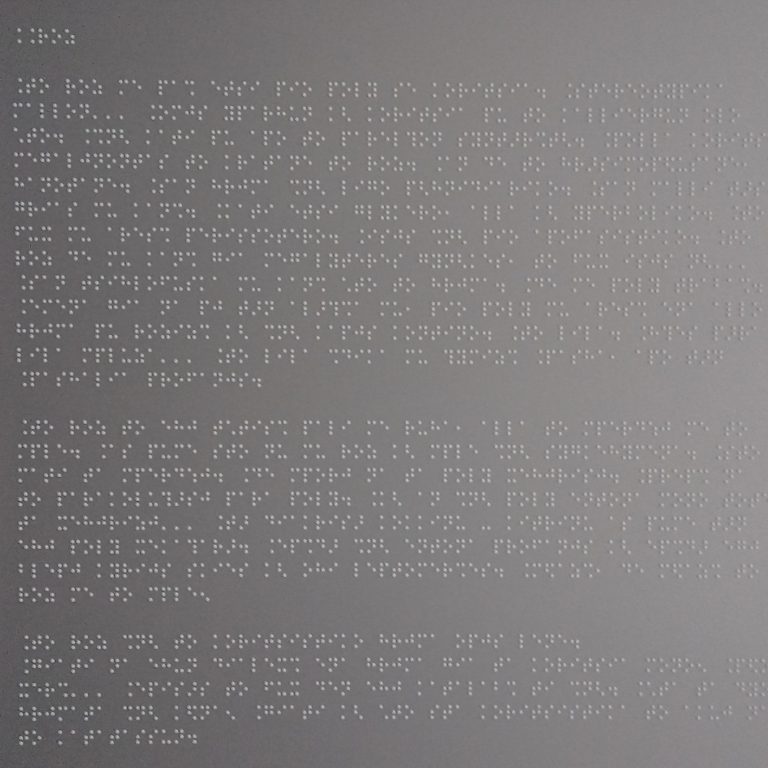 The artwork consists of wall-mounted text panels, written in Braille, based on interviews with people with visual impairment issues, describing how they see, remember or imagine colours.