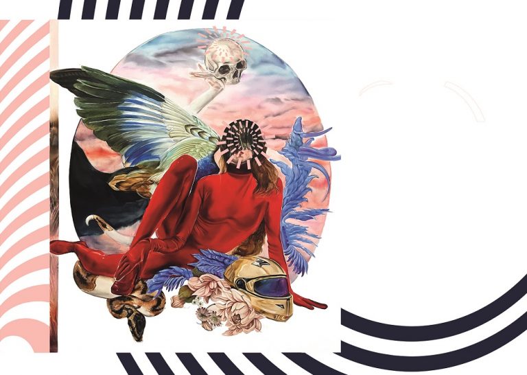 In her work, Rania Emmanouilidou uses timeless symbols integrated in the modern era, with references to the world of fashion and advertising. The angel of death is transformed into a provocative woman, the knight’s helmet turns into a motorcycle helmet, dead animals are replaced by a living snake, dead flowers are plastic and the skull is illuminated by a triumphant light, dispersed all over the work. Through vivid and bright colors, she weaves an enticing ambiance, “mocking death, turning a blind eye to the menacing corners of the world and stressing the futile nature οf modern culture and symbol consuming,” as she explains.