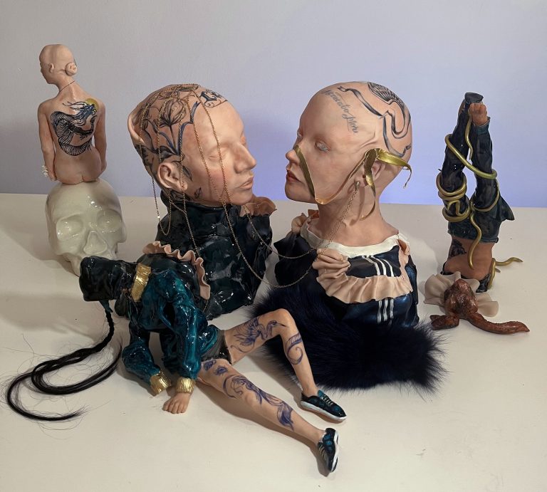 Even though this thematic is no unknown territory for her, as several of her works navigate through this field, she chose to take part in the exhibition with two new creations. A painting titled Angel, Angel, Down We Go Together and a sculpture titled The Trap.